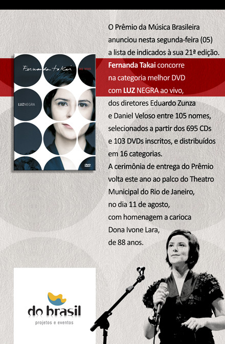 1. É mesmo Dudi. E vale lembrar que no 5º Prêmio Bravo, ‘Luz Negra’ venceu como melhor show e concorreu com “Banda Larga Cordel”, Gilberto Gil e “Pequeno Cidadão”, Arnaldo Antunes, Edgard Scandurra, Taciana Barros e Antonio Pinto. Então, estou confiante!!! Que venha mais um prêmio!