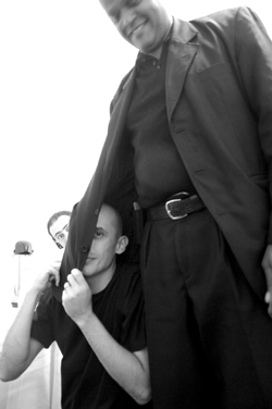 Evaristo chegou sério, enorme, óculos escuros. Quem o via de longe temia ter que passar por ele. Mas foi num dos primeiros dias de convívio que descobrimos que ele tinha uma das risadas mais engraçadas do mundo. Do tipo que contagiava o ambiente. Ouvimos uns guinchos fininhos lá na parte da frente do ônibus que era onde ele gostava de viajar. “Evaristo? Você tá passando mal?”. Tava nada, tava é morrendo de rir de uma piada. Ele era assim mesmo. Perdia o freio. Andava sempre ouvindo música com seus fones de ouvido. Adorava cantar num pseudo-inglês-embromation. Em algumas passagens de som, se o tempo estava sobrando, ele ia pro meio do palco dar um tostão de sua voz, com poses perfeitas de crooner. Um dia vimos o Eva – apelido carinhoso incompreensível pra quem ouvia de fora – dançar. Ele dançava soul, funk, black music como ninguém. Com certeza seria da turma de Tony Tornado, Nelson Triunfo, James Brown e The Jackson Five se morasse em alguma daquelas vizinhanças… Havia um momento do show que não resistíamos e chamávamos o Eva pra dançar. Era um espetáculo. A plateia não acreditava. E ele saía aclamado do palco. “Êêêvaristo, Êêêvaristo, Êêêvaristo eu estou aqui!”. Era o grito de guerra que a gente puxava com o público numa paródia da música de Roberto e Erasmo.